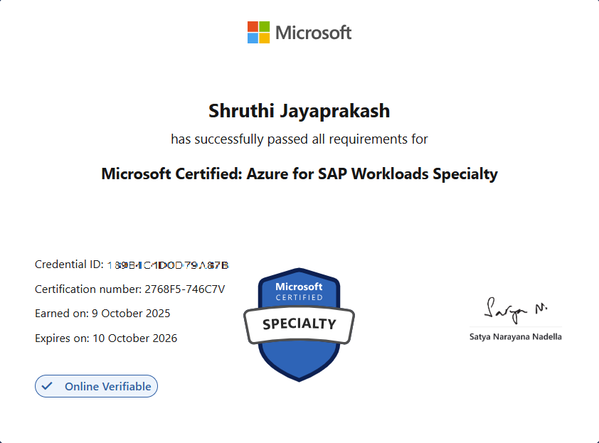 Shruti har bevist at hun nu har opnået en ekspertise inden for design, administration og optimering af SAP-workloads på Microsoft Azure. Med denne certificering har Shruti opnået viden om komplekse cloud-migrationsprojekter, hvordan man sikrer høj tilgængelighed og ydeevne for SAP-systemer, samt hvordan man designer skalerbare og sikre løsninger for virksomhedskunder, der benytter Azure.